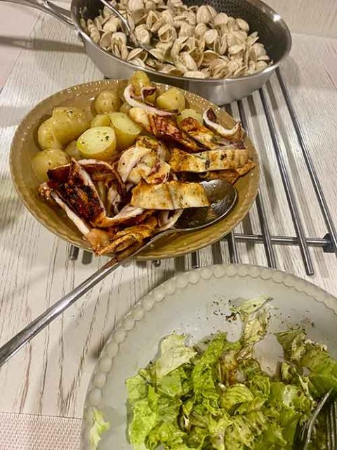 As lulas eram frescas, foram grelhadas na brasa apenas temperadas com sal. No final cortei em pedaços, juntei as batatinhas cozidas e reguei com uma mistura feita com azeite, vinagre e oregãos.