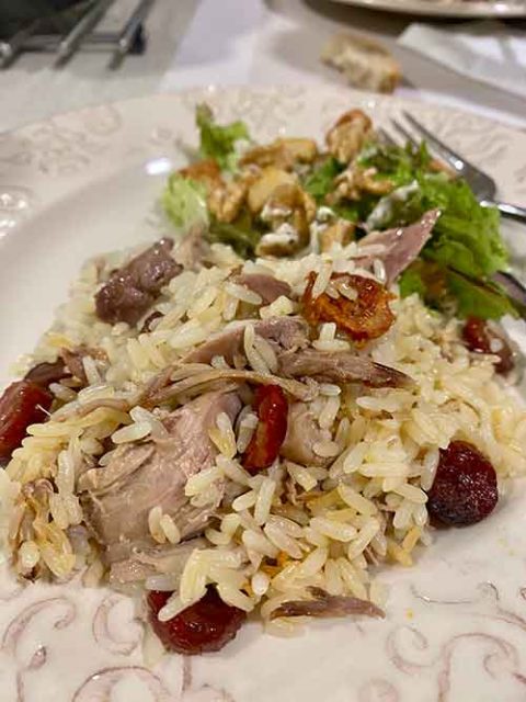 Num recipiente de forno coloca-se o pato desfiado, o chouriço ou linguiça em rodelas e por cima o arroz.