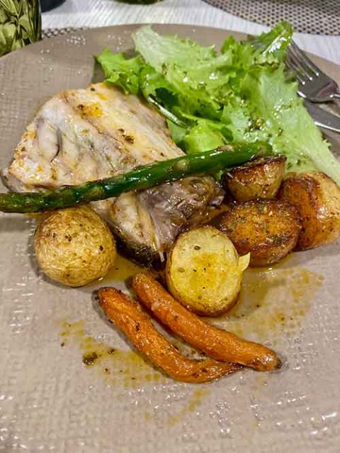 Peixe no Forno com Batatinhas, Cenouras e Espargos